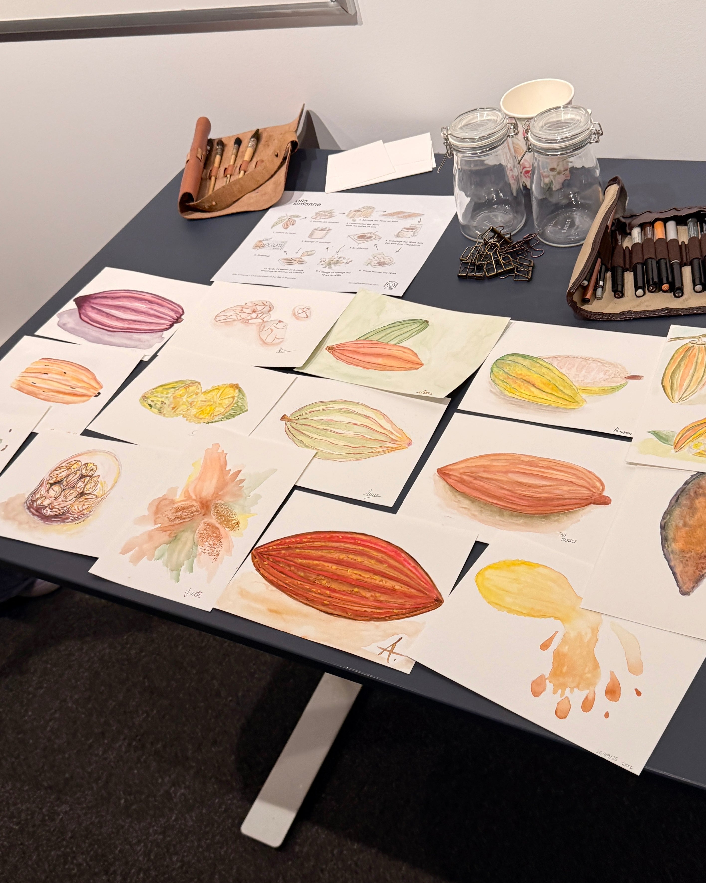 CrĂ©ation en aquarelle & dĂ©gustation sensorielle : Tout au long de la dĂ©gustation de chocolats, vos sens seront sollicitĂ©s pour inspirer votre Ćuvre. Une feuille de correspondances couleurs-goĂ»ts vous aidera Ă associer les notes gustatives (fruitĂ©, boisĂ©, Ă©picĂ©, douxâŠ) Ă des gammes de couleurs.Â