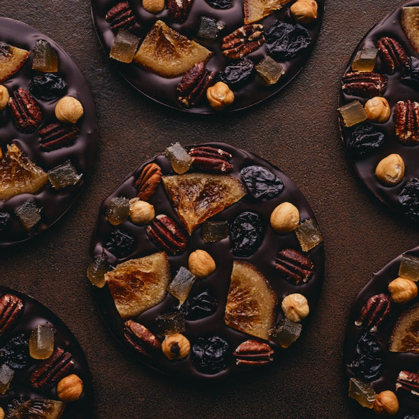 Ce délicieux mendiant au chocolat noir à 78% marie les notes intenses de cacao, les saveurs vibrantes des oranges confites par nos chocolatiers et le croquant réconfortant des noix.