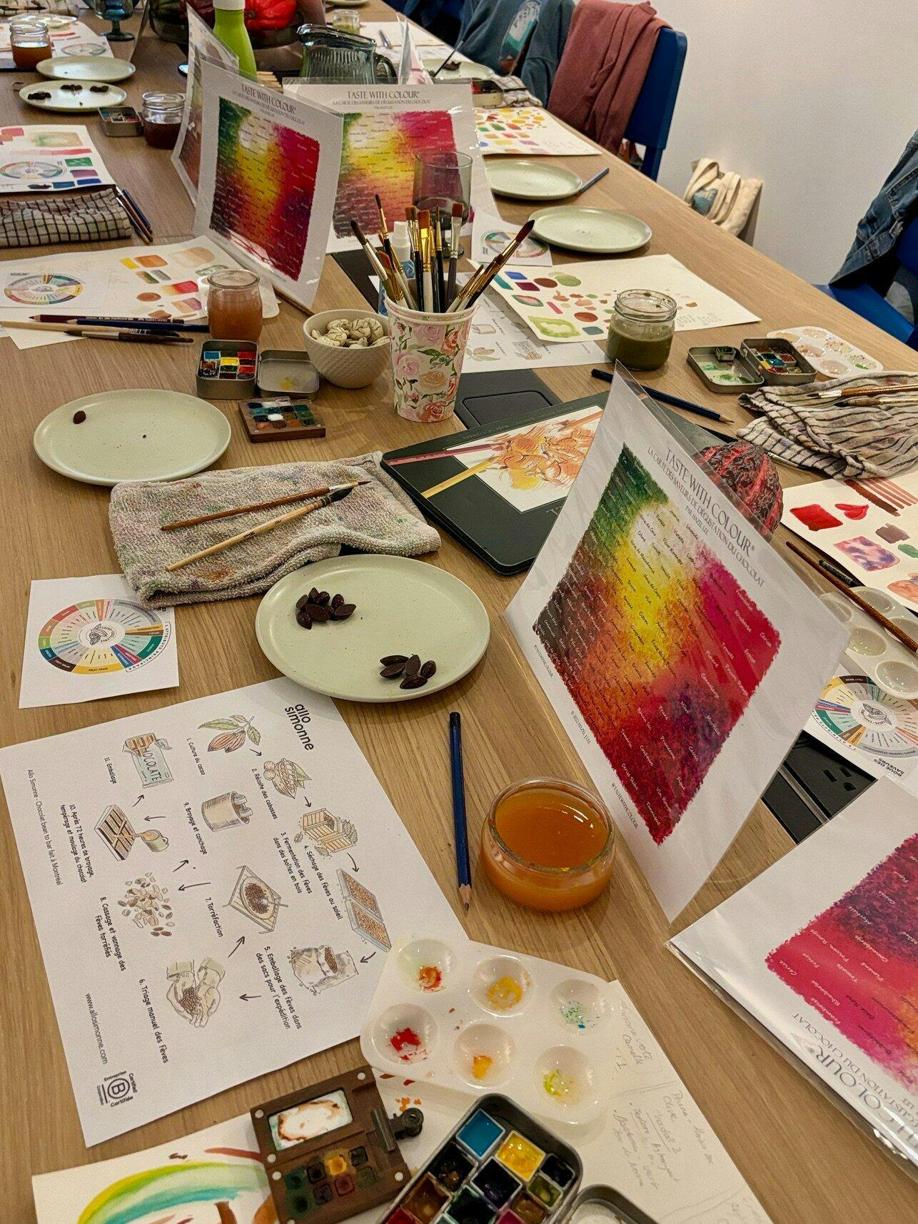 CrĂ©ation en aquarelle & dĂ©gustation sensorielle : Tout au long de la dĂ©gustation de chocolats, vos sens seront sollicitĂ©s pour inspirer votre Ćuvre. Une feuille de correspondances couleurs-goĂ»ts vous aidera Ă associer les notes gustatives (fruitĂ©, boisĂ©, Ă©picĂ©, douxâŠ) Ă des gammes de couleurs.Â