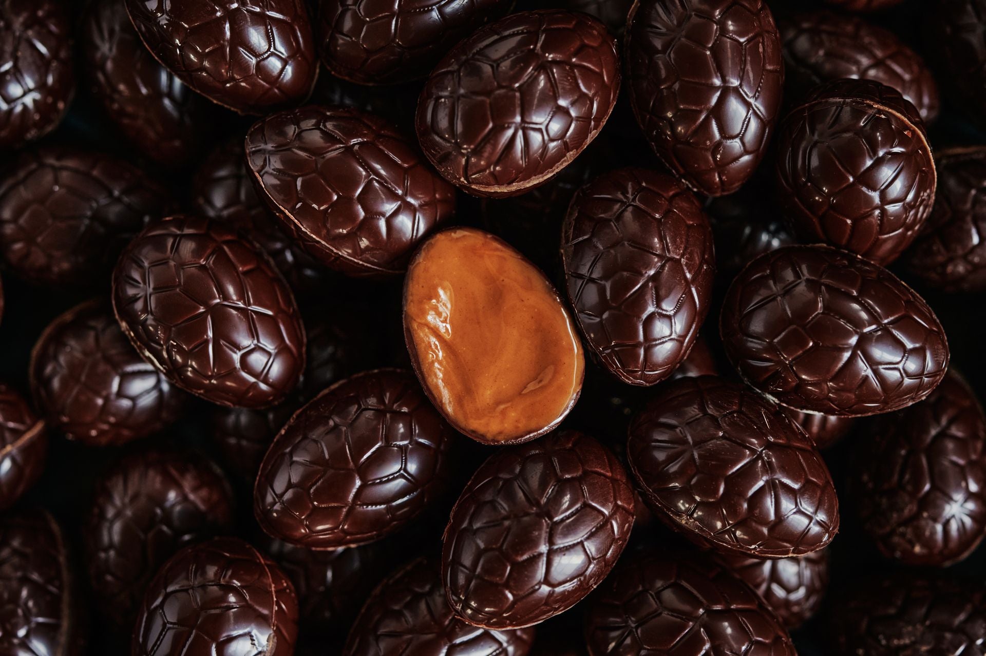 Des petits œufs en chocolat noir en format bouchées, garnis de notre irrésistible gianduja.